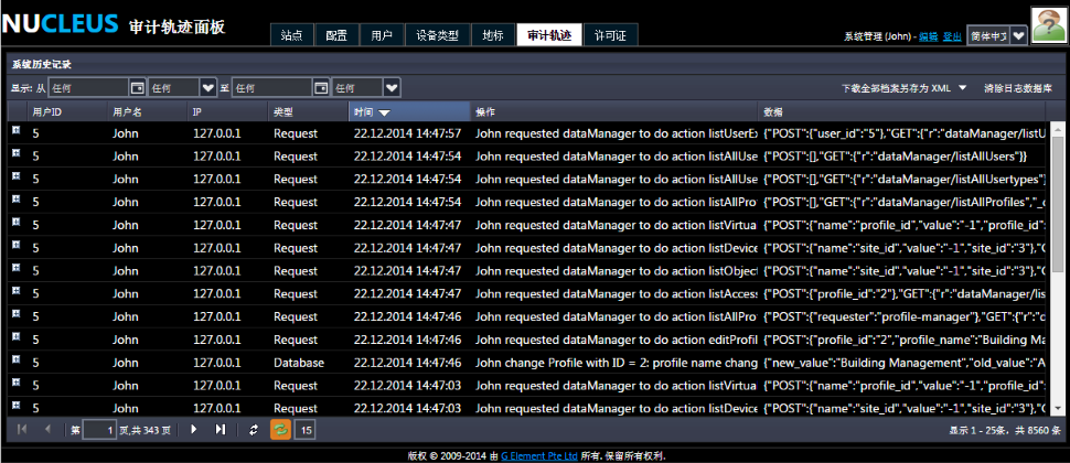 NUCLEUS 会记录用户所进行的各项操作;如果你是系统管理员,你还可以在审计轨迹面板中查看这些操作,如下图所示。