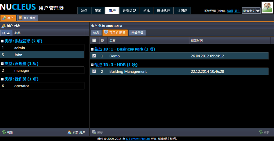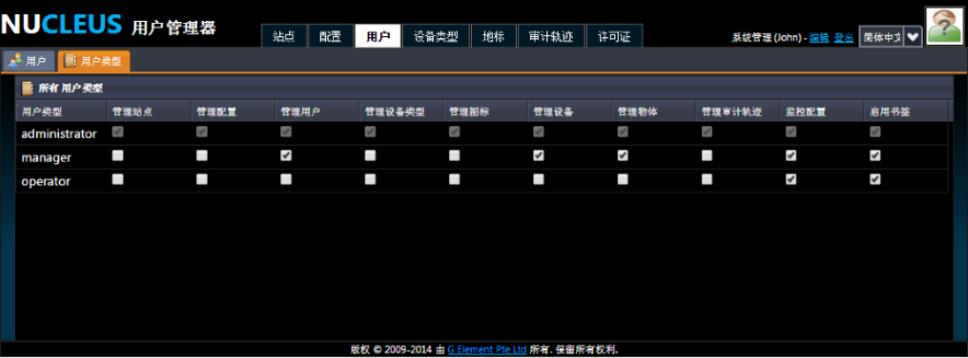 我们已经知道,NUCLEUS 有三种用户类型:系统管理员、管理员和操作员。根据系统的初设设置,这三类用户的权限是不同的:系统管理员有不能更改的最高权限;相比之下,系统管理员可以更改管理者和操作员的权限。