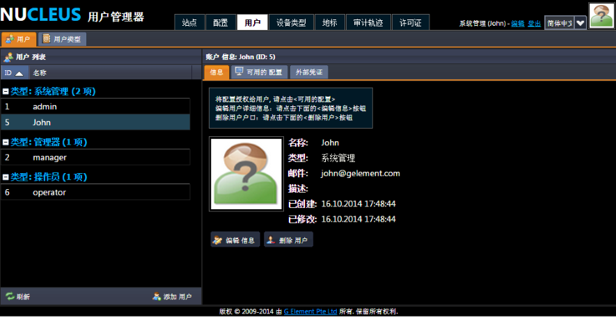 如上图所示,”信息“标签下显示了当前所选用户的基本资料,比如用户名和类型等。同时,你也可以点击”编辑信息“来更新当前所选择的账户的基本资料,例如密码、用户类型和E-mail等;若需删除该用户,请点击”删除用户“。