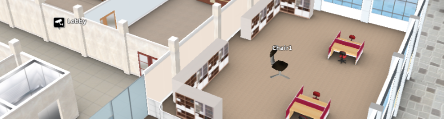 对于每一个 NUCLEUS 的设备或者物体,它都有一个标符来表明其在三维视图中的位置。一个标符可以是一个二维的图标或者一个三维的模型。在下图中,监控摄像机“Lobby” 的标符就是一个二维的图标,而物体“Chair1”的标符就是一个三维的模型。